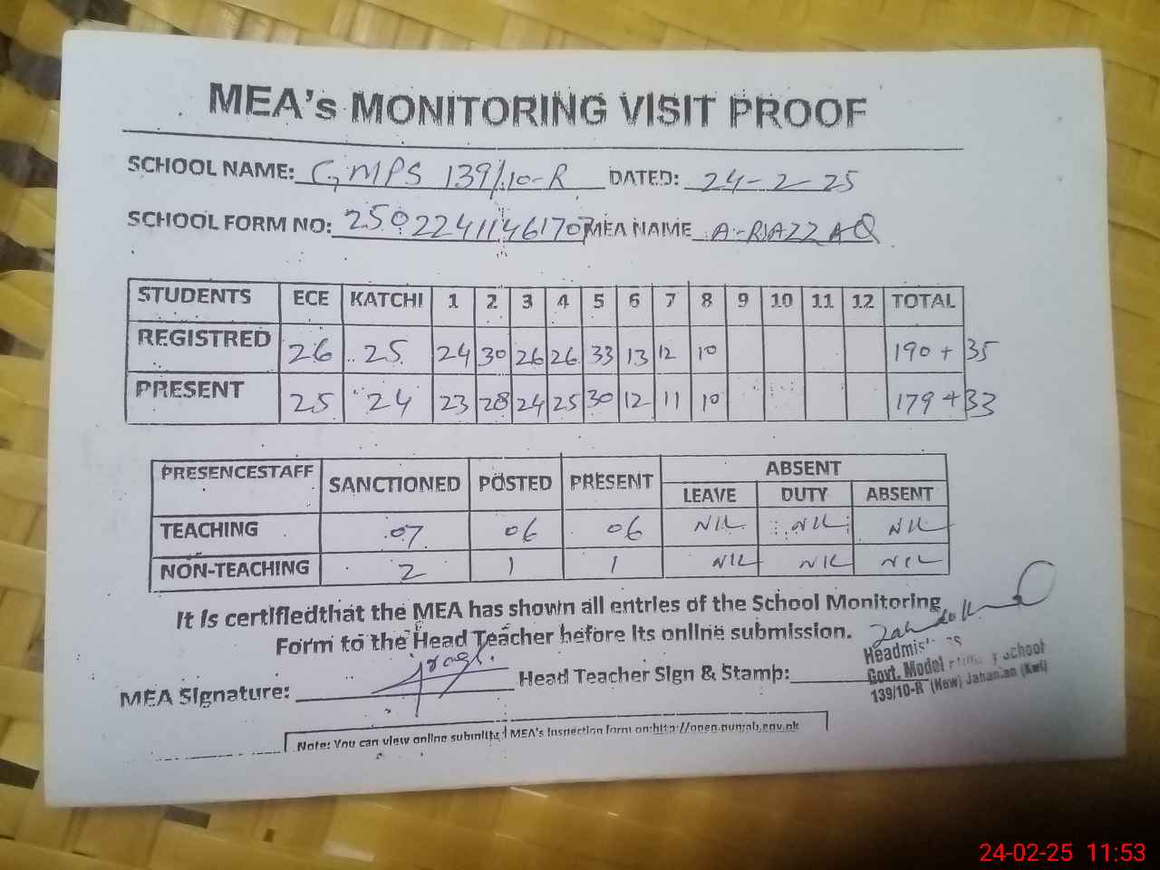 | EMIS Code: 36440533 | Name of School: GMPS 139/10-R JADEED, JAHANIAN | |||