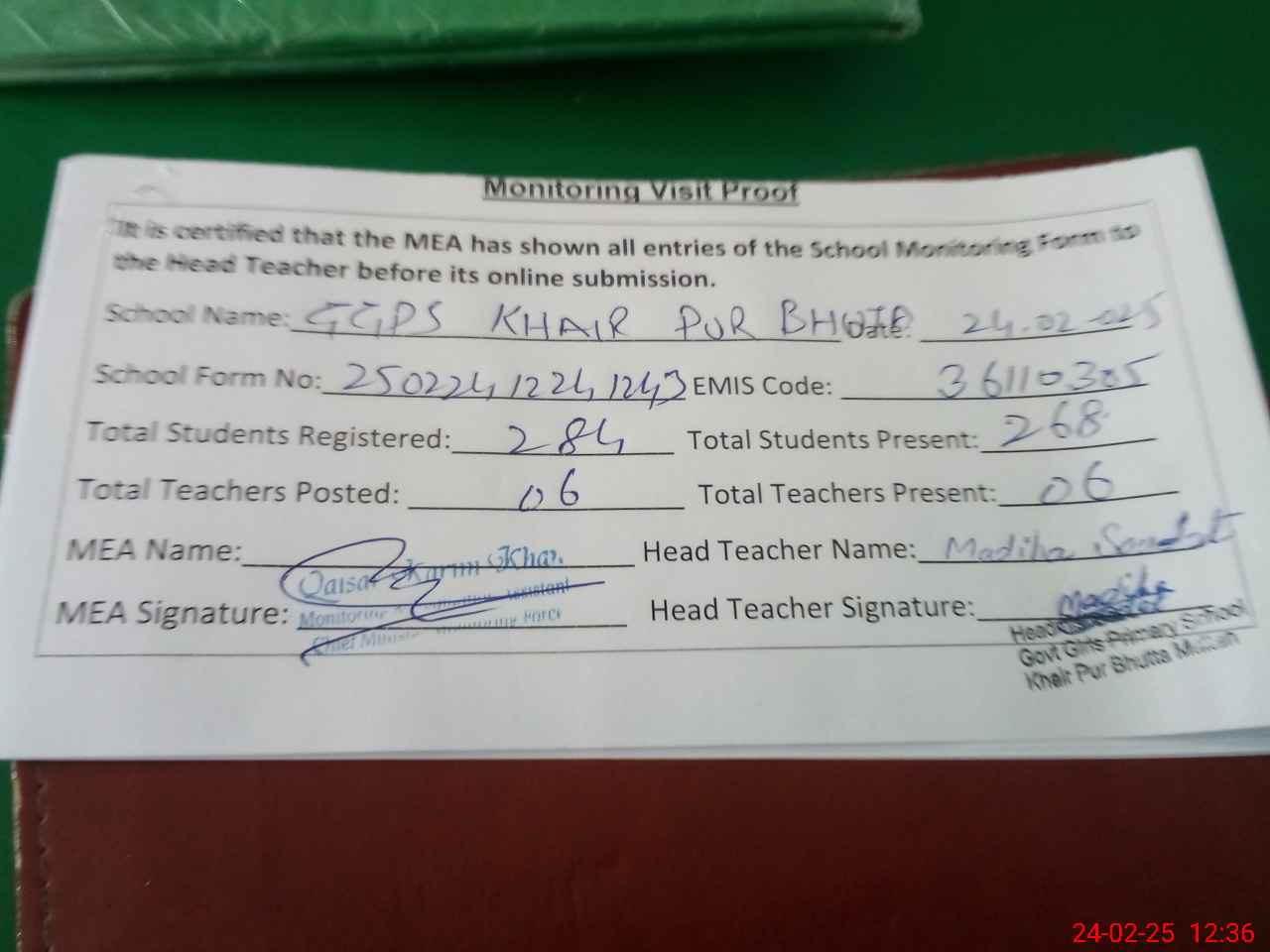 | Attendance Register | Head Teacher | MEA with School | Visit Proof |