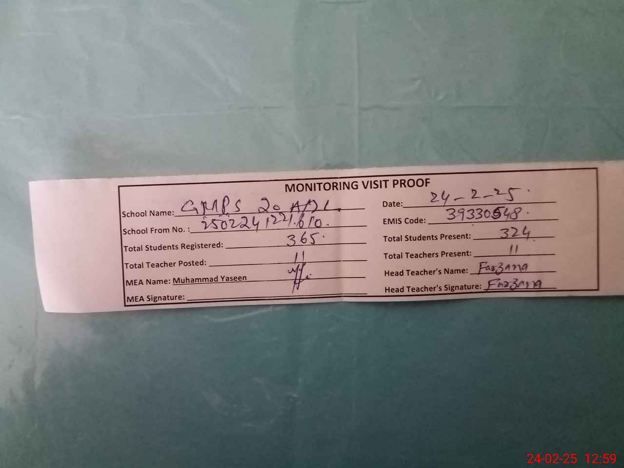 | EMIS Code: 39330548 | Name of School: GMPS 20 A-2L (ALEEM TOWN) | |||