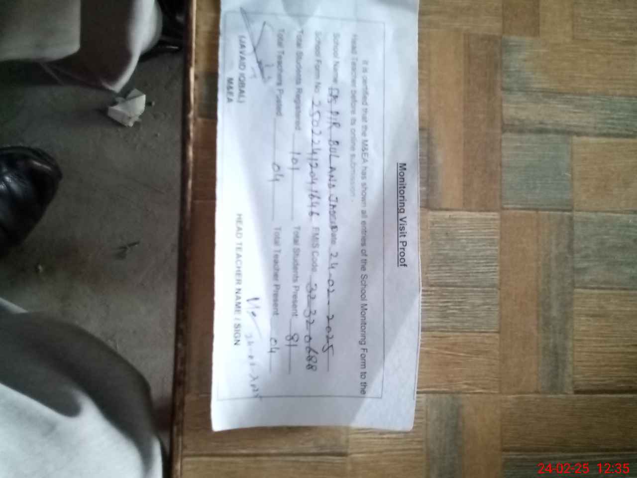 | Certified that this School was Inspected by the Undersigned MEA/DMO Today and the Information Stated Above is as Per Record. | |||||