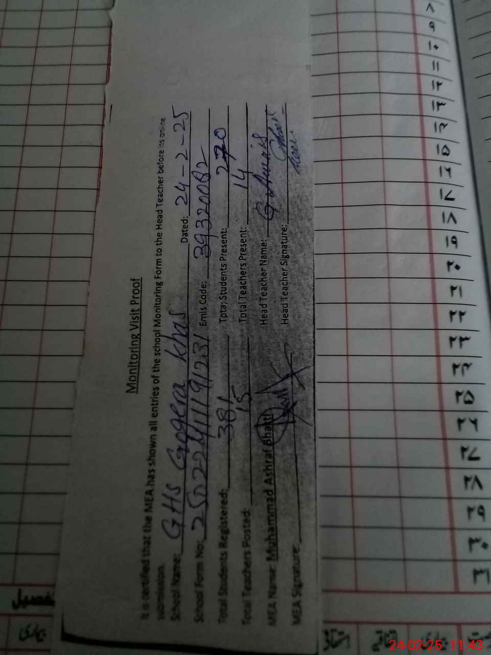 | Attendance Register | Head Teacher | MEA with School | Visit Proof |