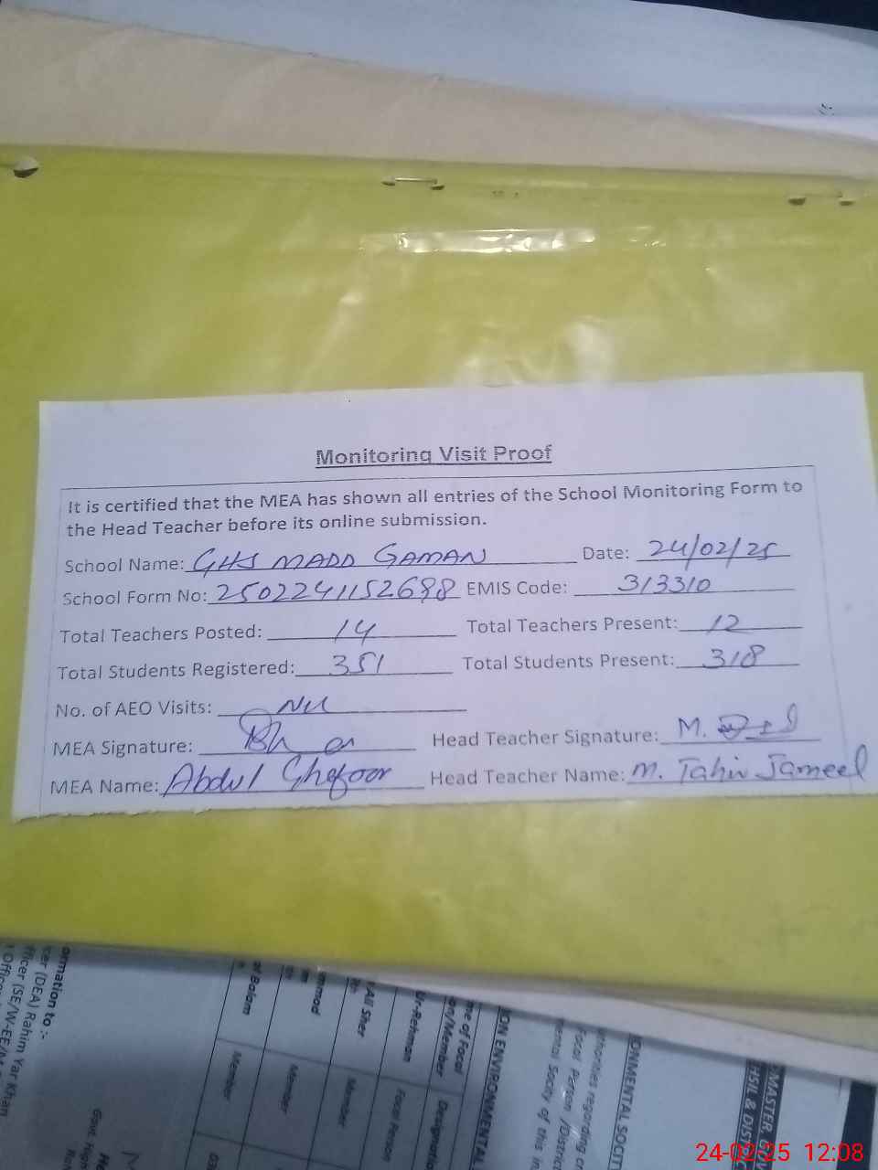 | Attendance Register | Head Teacher | MEA with School | Visit Proof |