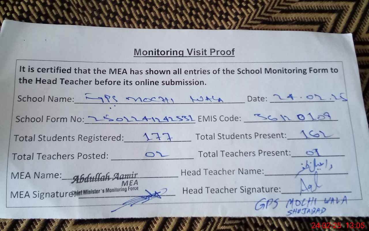 | Certified that this School was Inspected by the Undersigned MEA/DMO Today and the Information Stated Above is as Per Record. | |||||