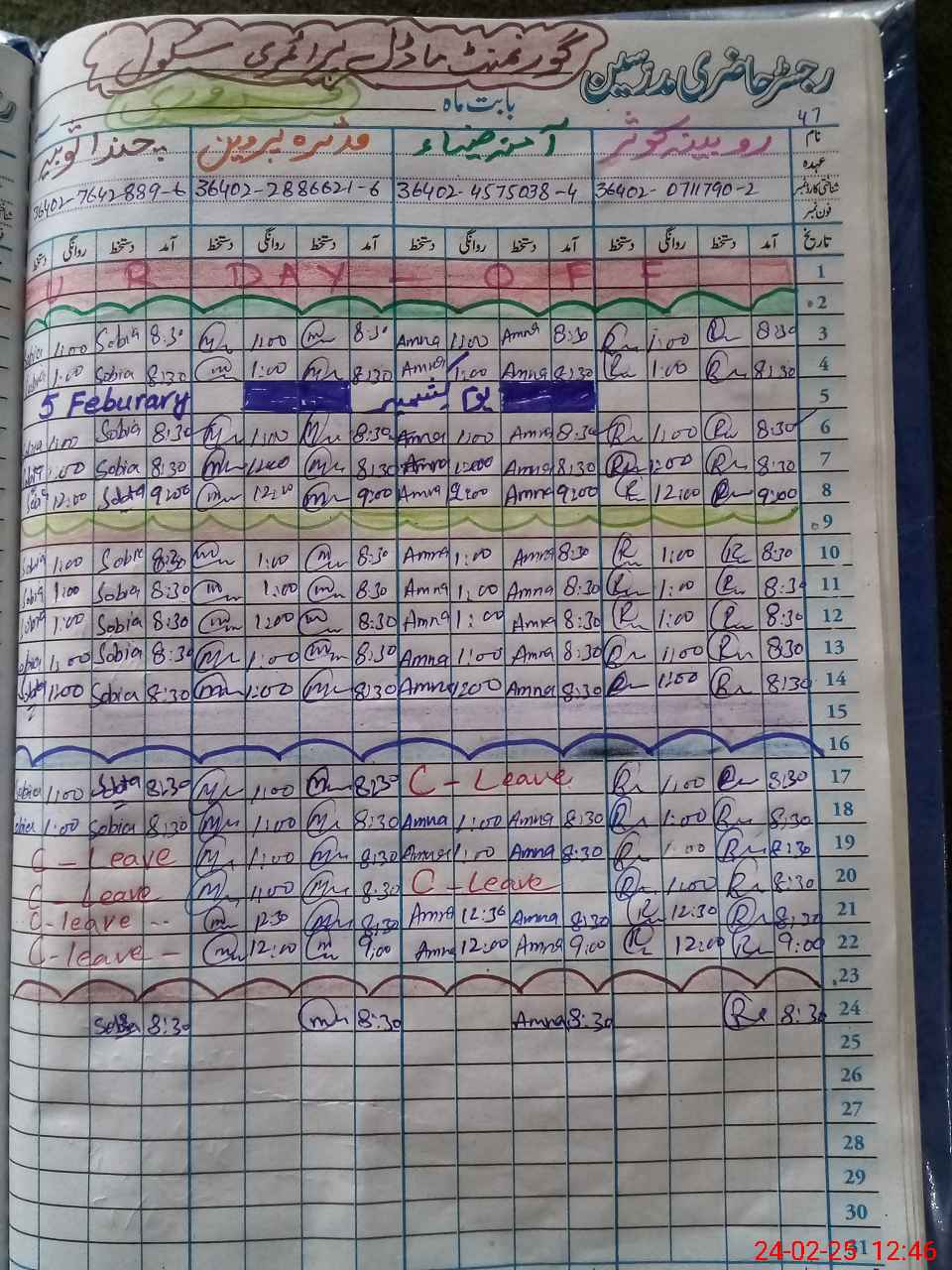 | Leave | Duty | Absent | Maternity | Medical | Ex- Pak |