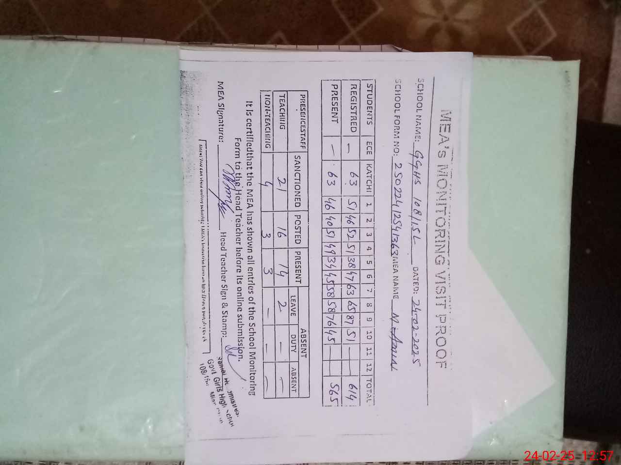 | Attendance Register | Head Teacher | MEA with School | Visit Proof |