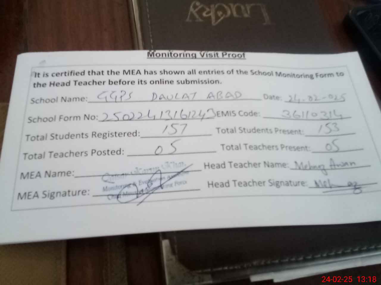 | Attendance Register | Head Teacher | MEA with School | Visit Proof |