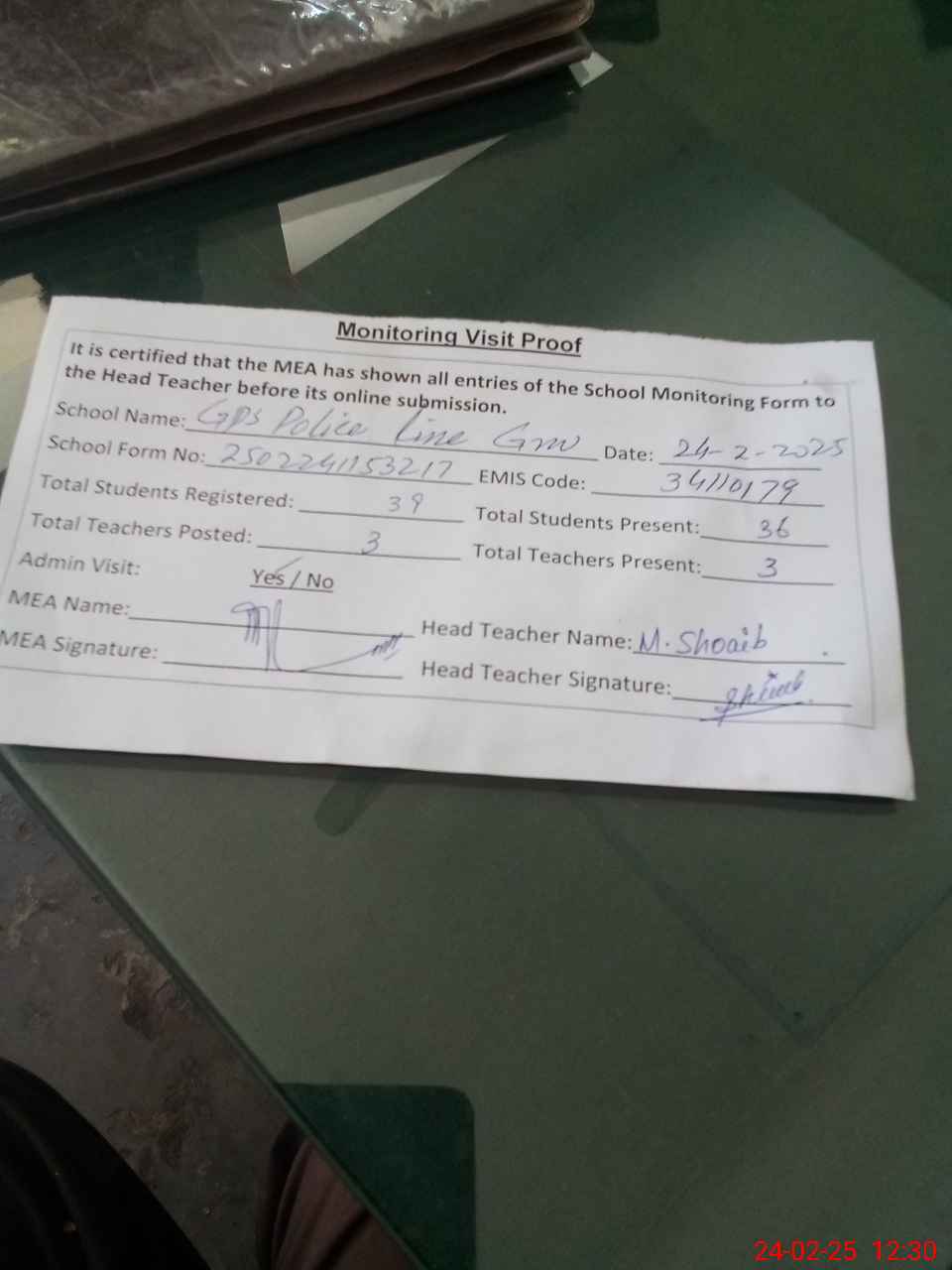 | Attendance Register | Head Teacher | MEA with School | Visit Proof |