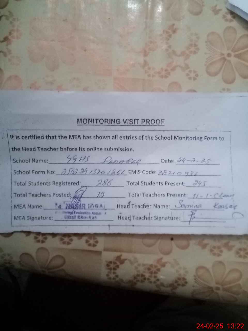 | Attendance Register | Head Teacher | MEA with School | Visit Proof |