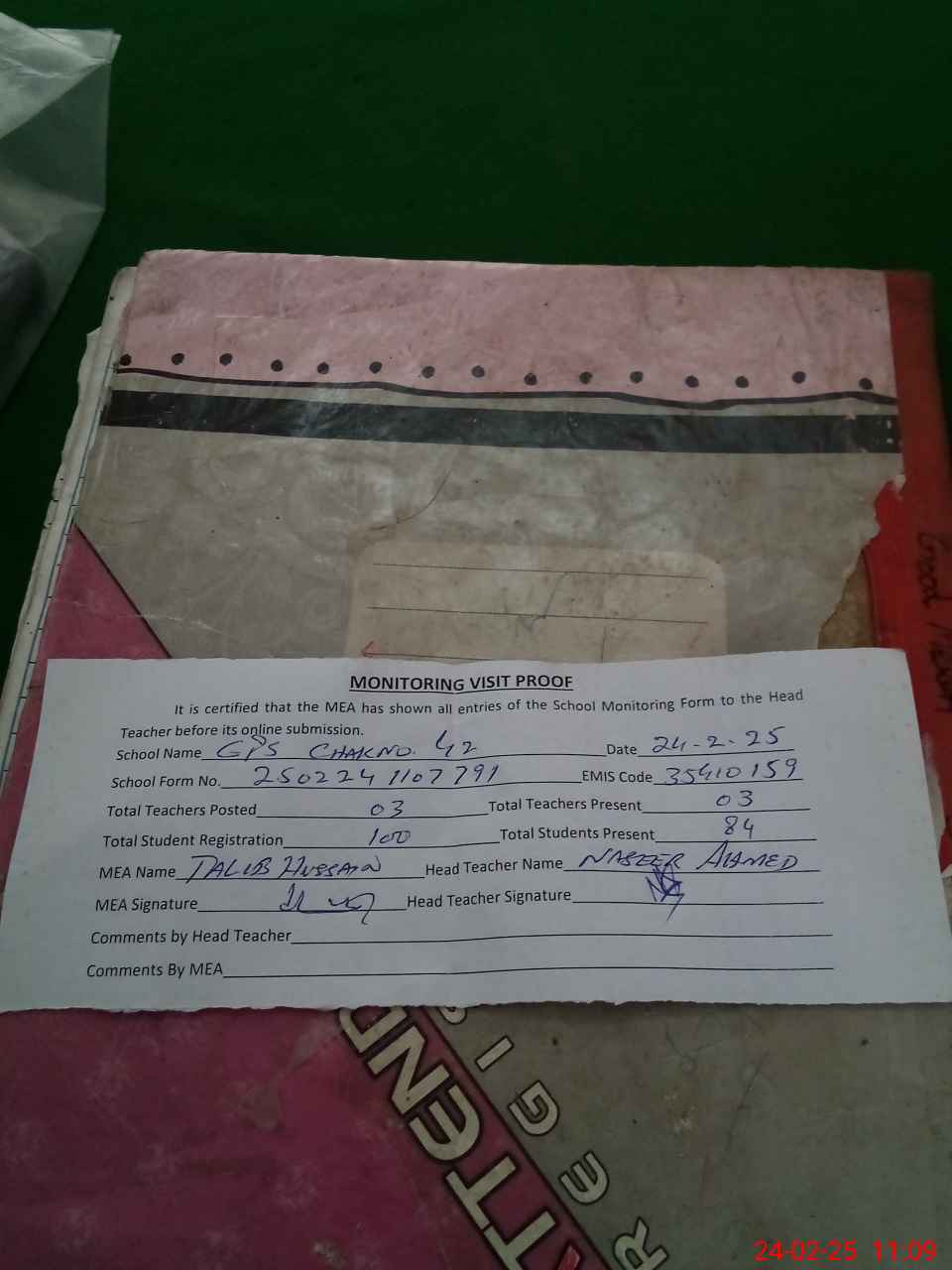 | Attendance Register | Head Teacher | MEA with School | Visit Proof |