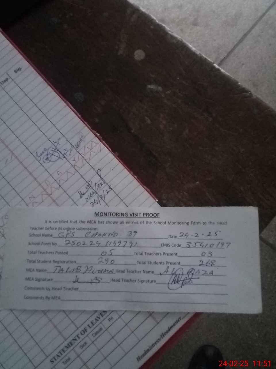 | Attendance Register | Head Teacher | MEA with School | Visit Proof |