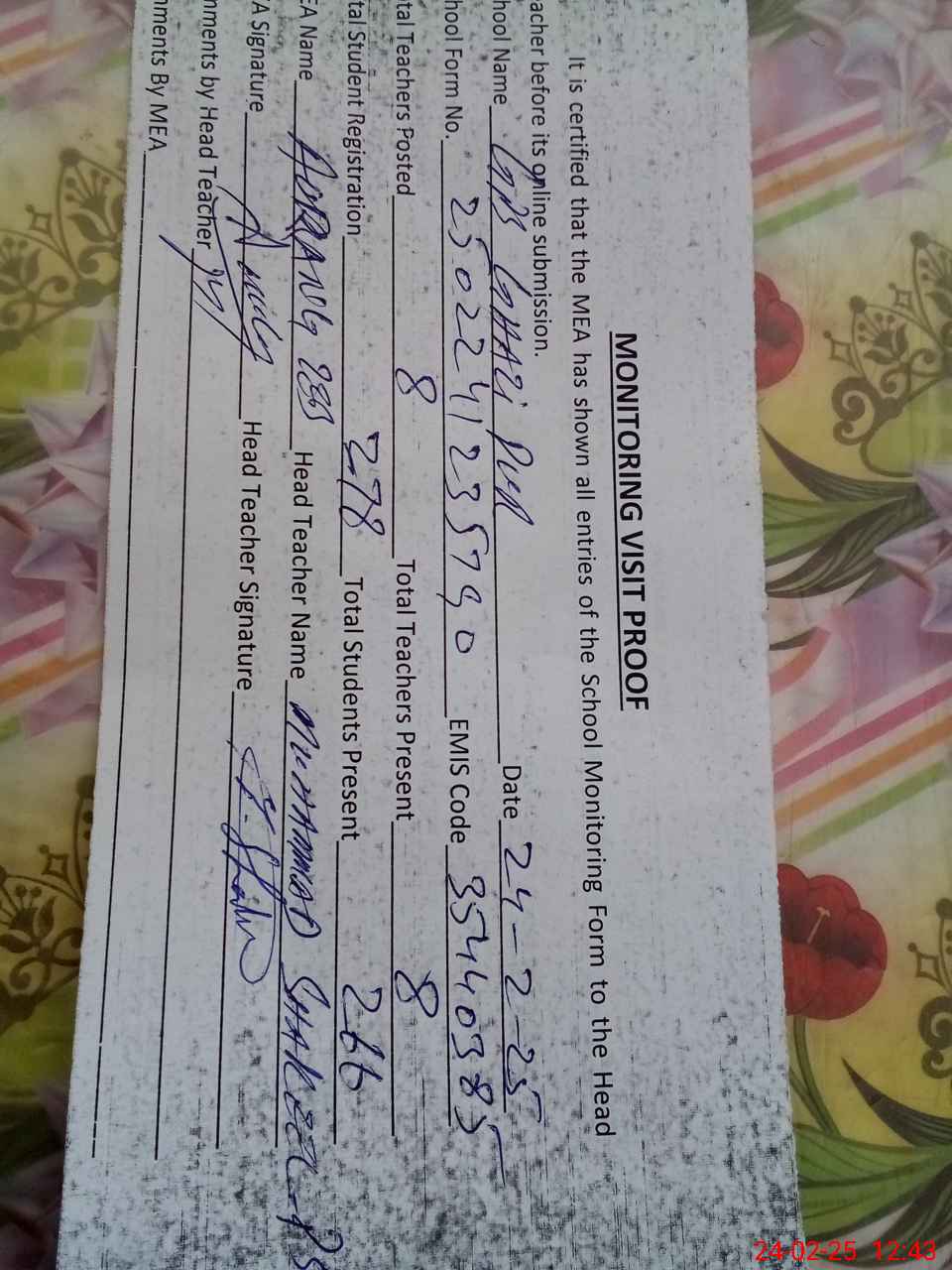 | Attendance Register | Head Teacher | MEA with School | Visit Proof |