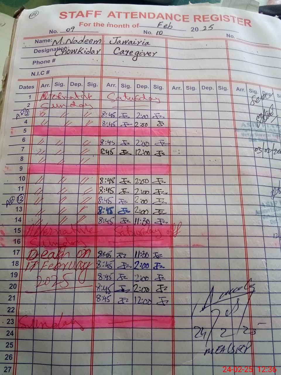 | CNIC | Full Name | Designation | R/C | Absence during last cal. month |