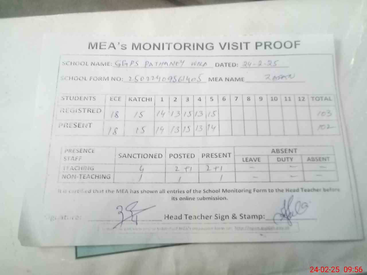 | Attendance Register | Head Teacher | MEA with School | Visit Proof |