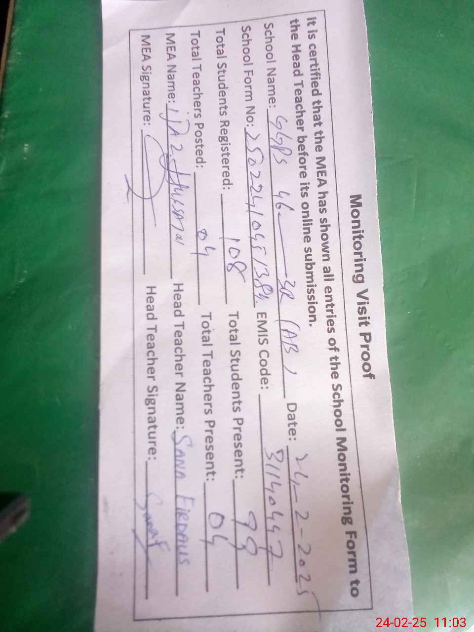 | Attendance Register | Head Teacher | MEA with School | Visit Proof |