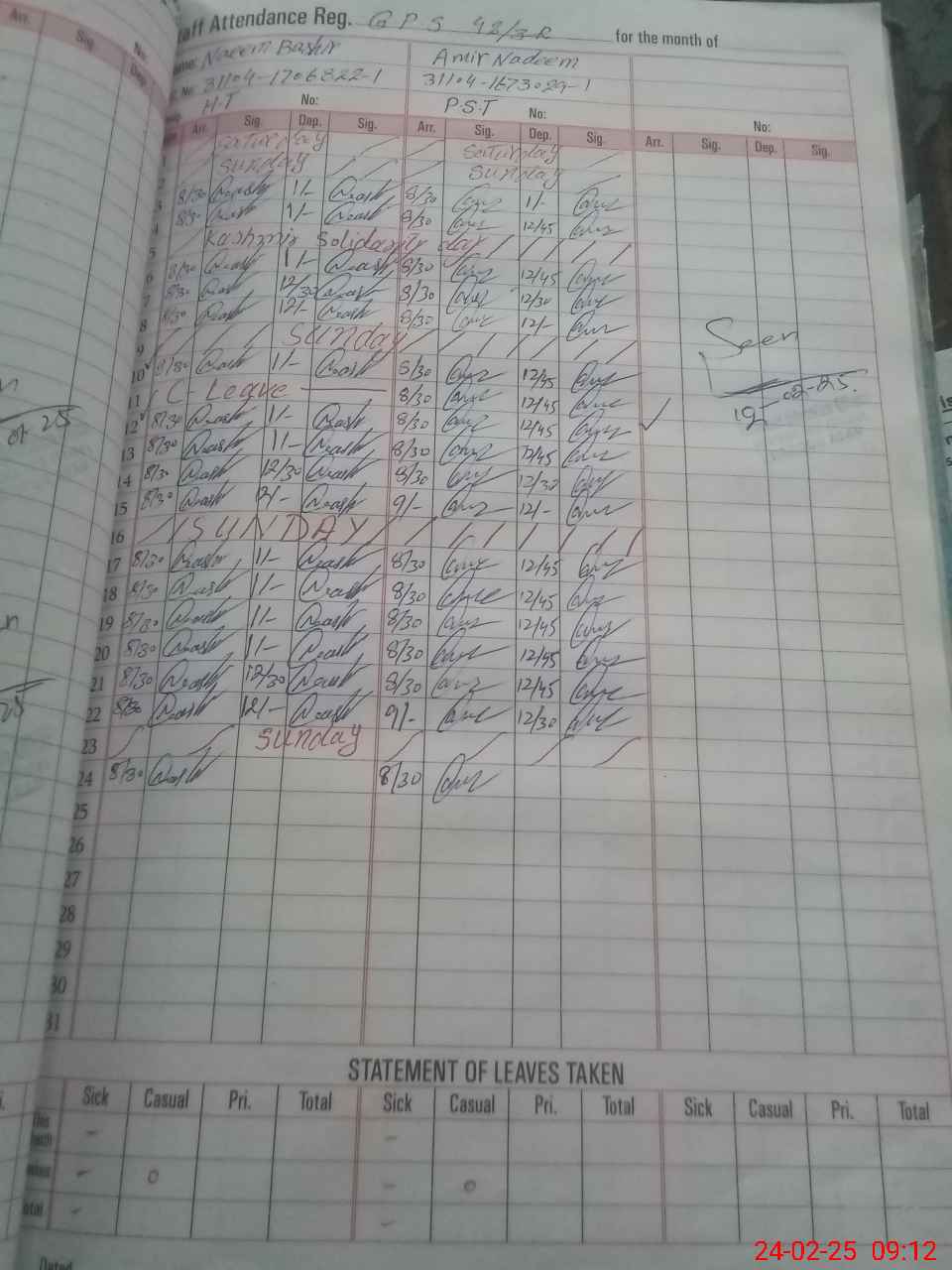 | CNIC | Full Name | Designation | R/C | Absence During Last Calender Month |