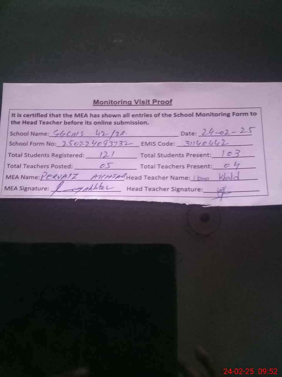 | Attendance Register | Head Teacher | MEA with School | Visit Proof |