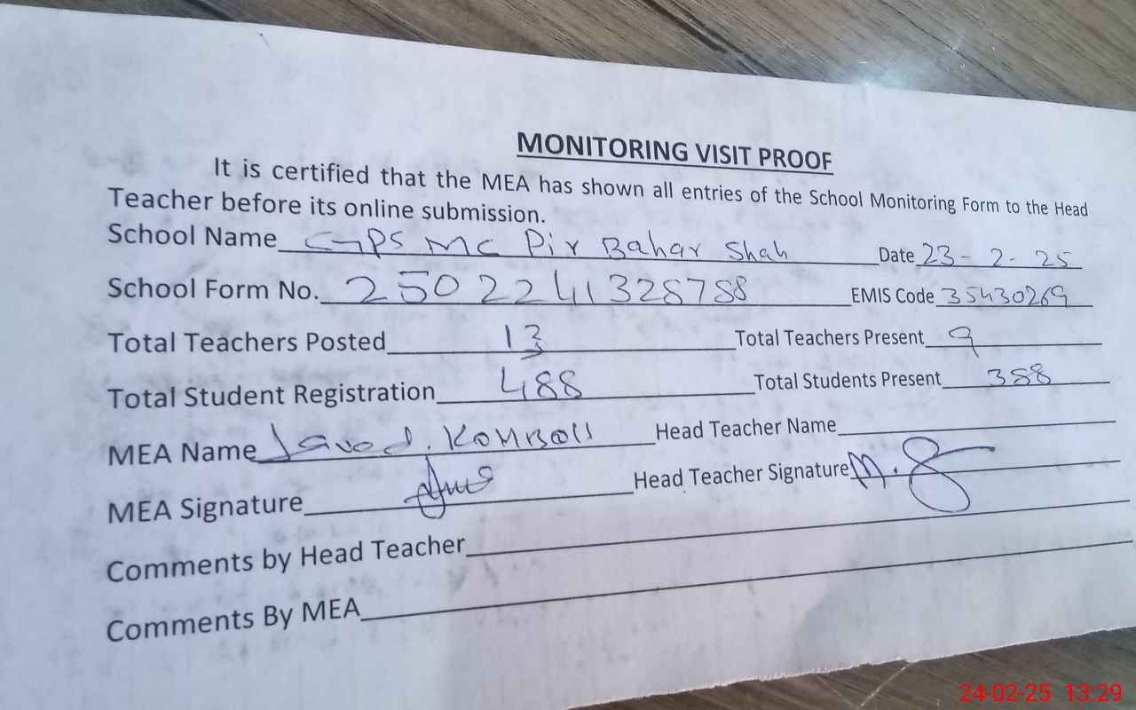 | EMIS Code: 35430269 | Name of School: GPS MC PIR BAHAR SHAH | |||