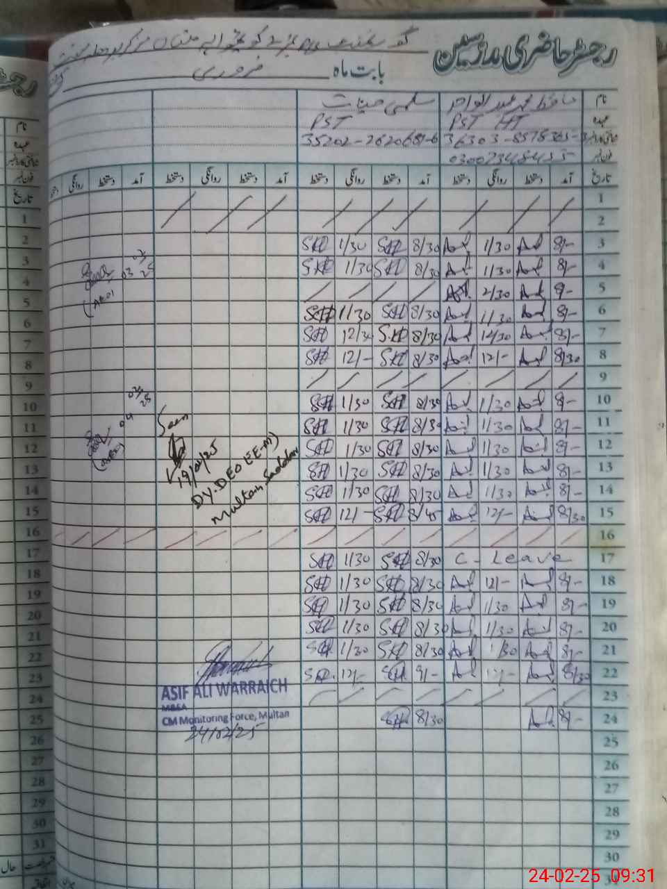 | CNIC | Full Name | Designation | R/C | Absence During Last Calender Month |