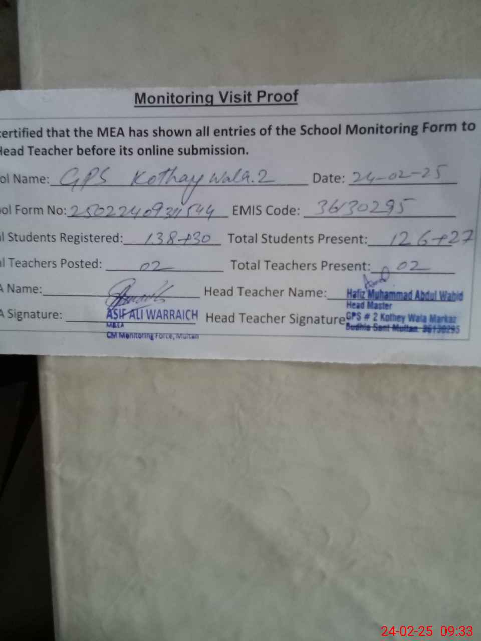 | EMIS Code: 36130295 | Name of School: GPS KOTHEY WALA NO. 2 MULTAN | |||