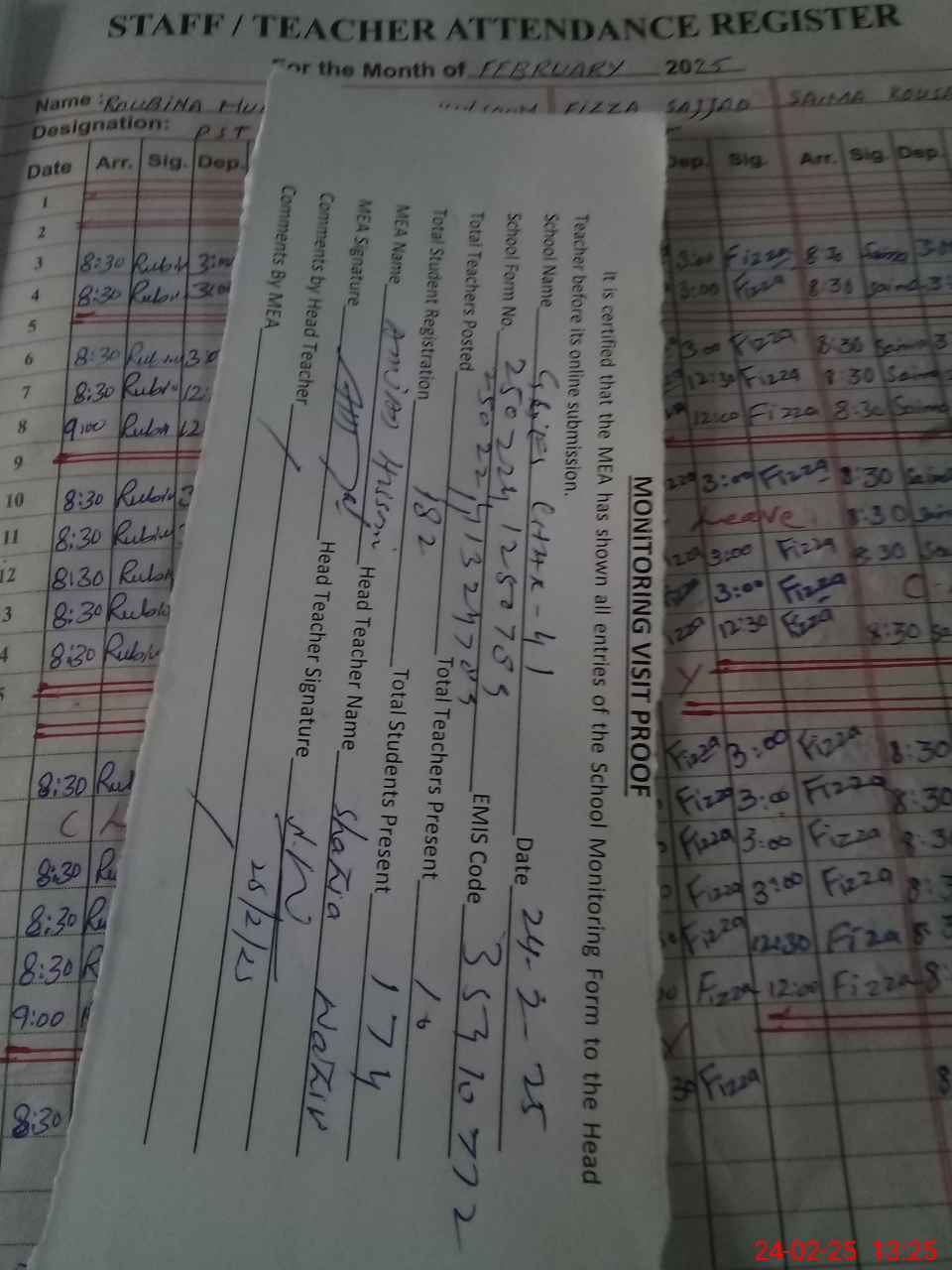 | Attendance Register | Head Teacher | MEA with School | Visit Proof |