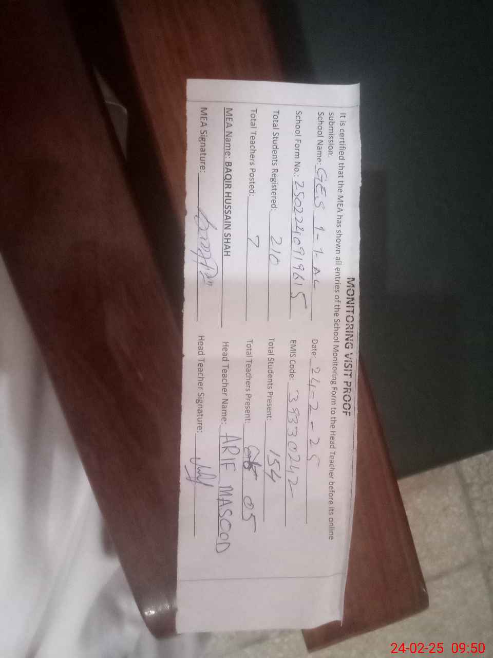 | Attendance Register | Head Teacher | MEA with School | Visit Proof |