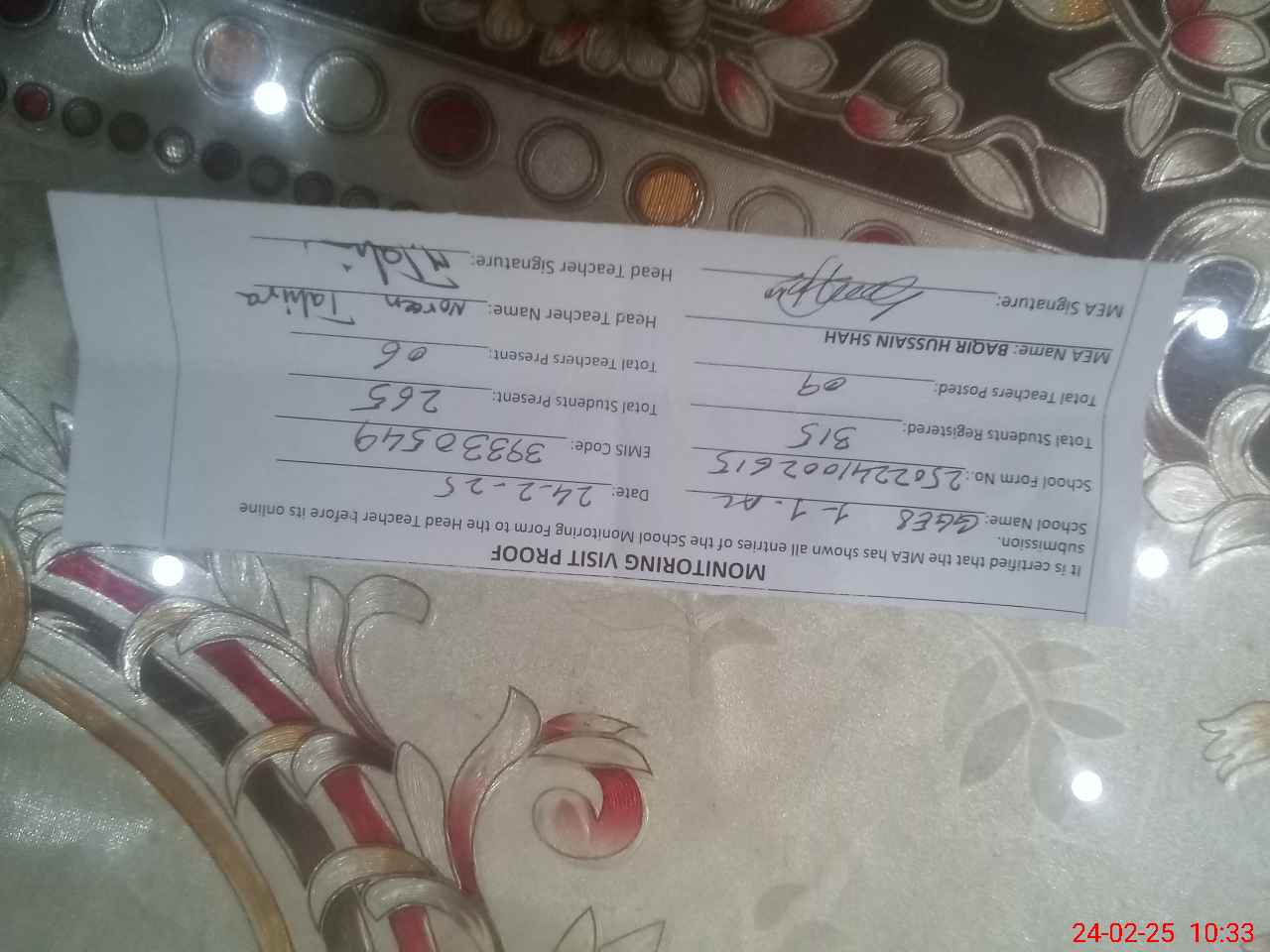 | Certified that this School was Inspected by the Undersigned MEA/DMO Today and the Information Stated Above is as Per Record. | |||||