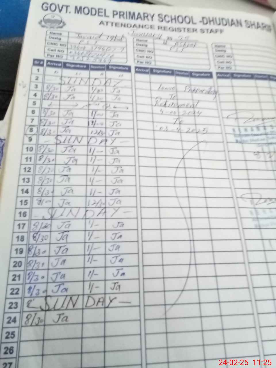 | CNIC | Full Name | Designation | R/C | Absence During Last Calender Month |