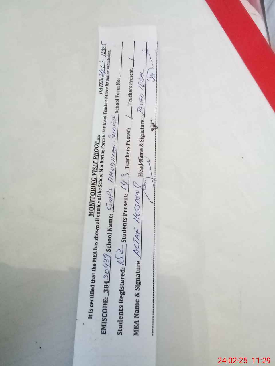 | Attendance Register | Head Teacher | MEA with School | Visit Proof |