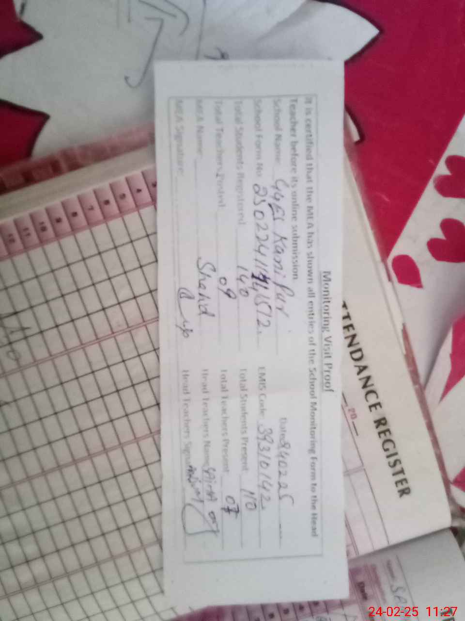 | Attendance Register | Head Teacher | MEA with School | Visit Proof |