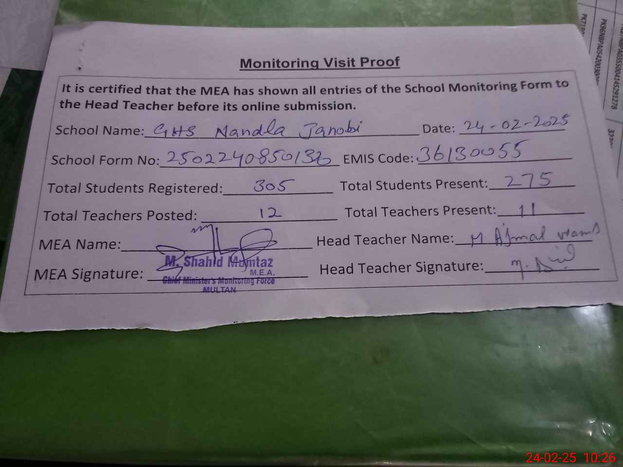 | Certified that this School was Inspected by the Undersigned MEA/DMO Today and the Information Stated Above is as Per Record. | |||||