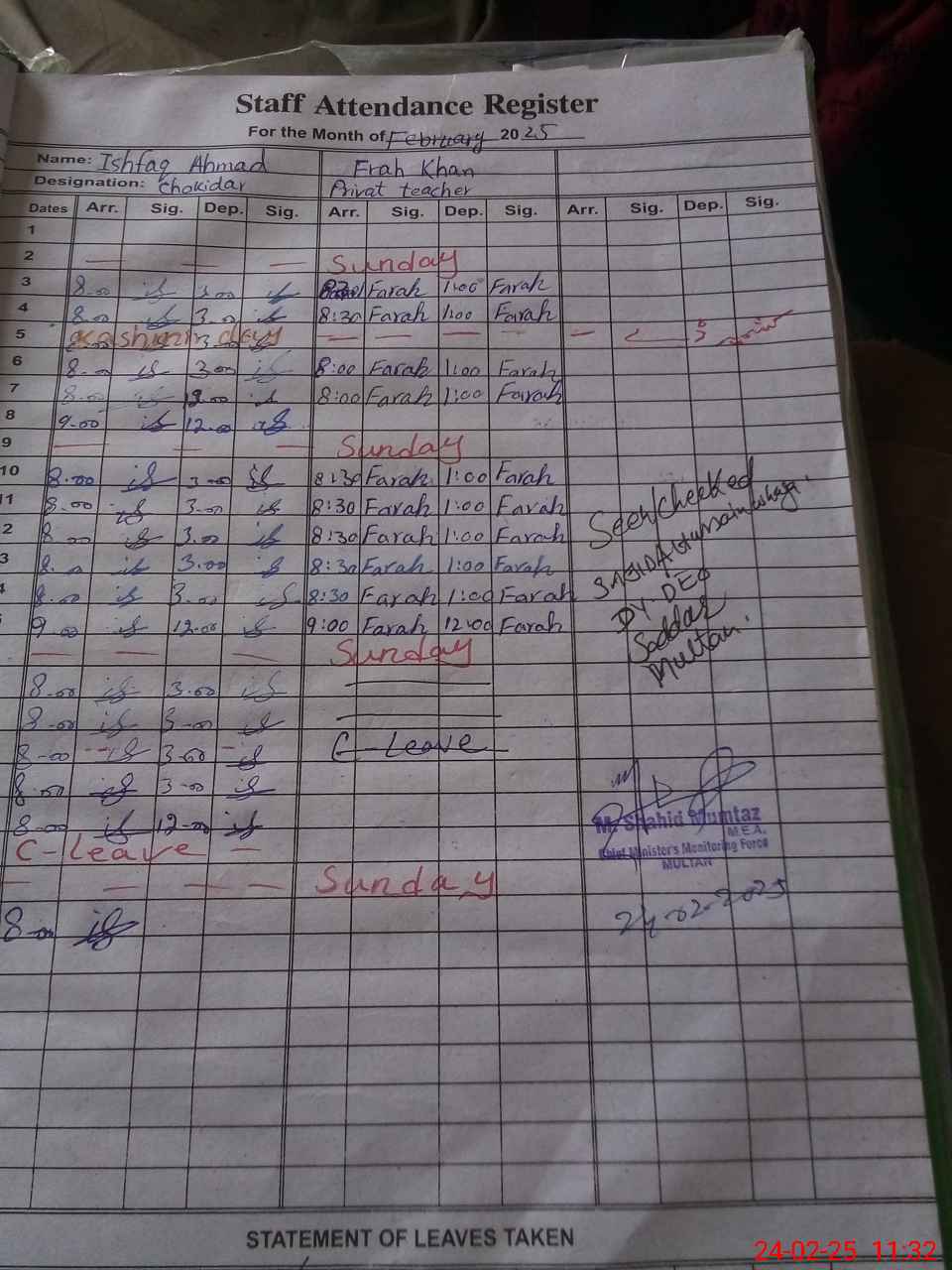 | CNIC | Full Name | Designation | R/C | Absence During Last Calender Month |
