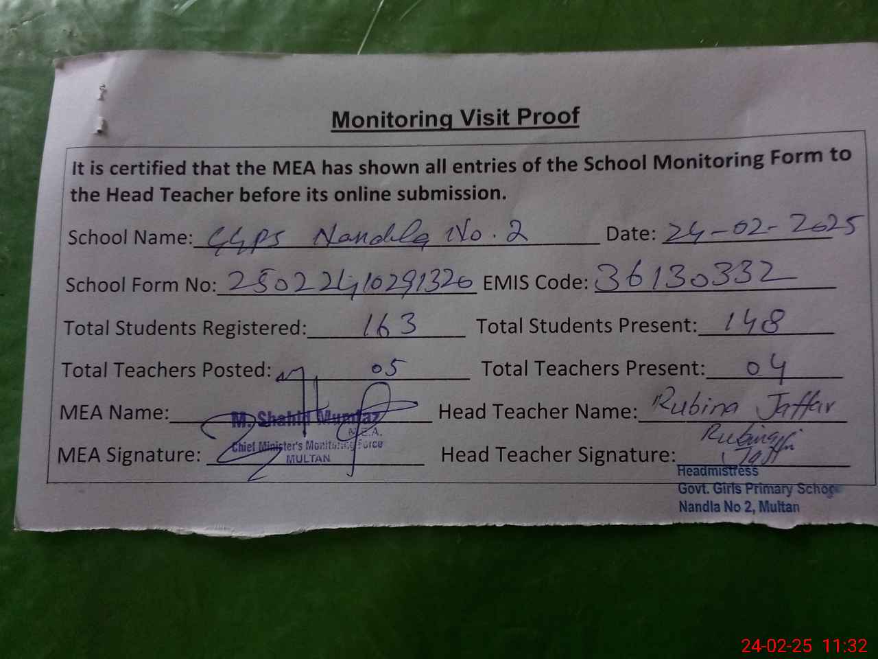 | Attendance Register | Head Teacher | MEA with School | Visit Proof |