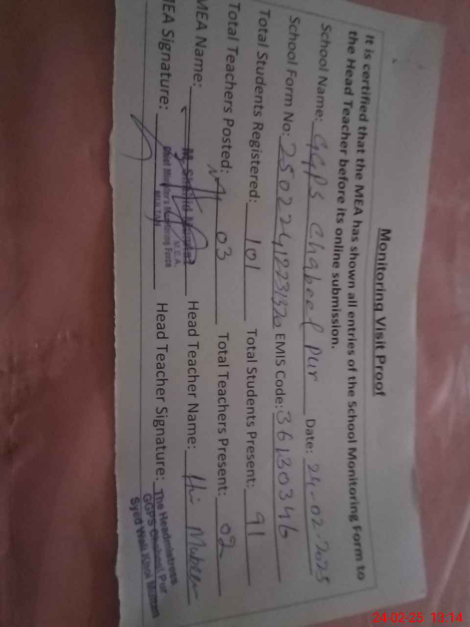 | Attendance Register | Head Teacher | MEA with School | Visit Proof |