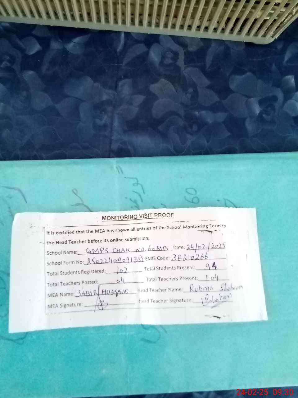 | Attendance Register | Head Teacher | MEA with School | Visit Proof |