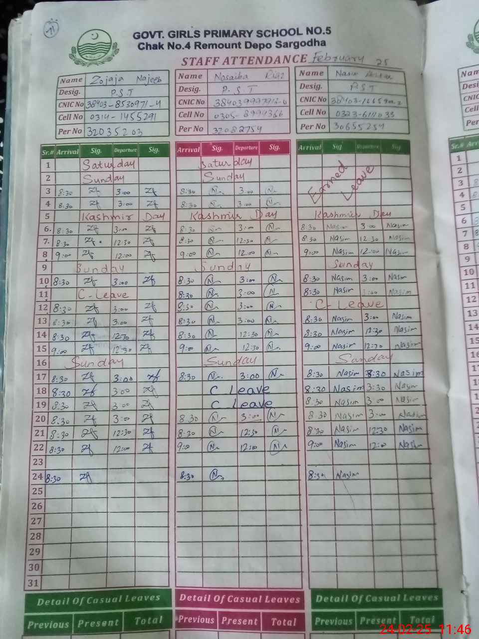 | CNIC | Full Name | Designation | R/C | Absence During Last Calender Month |