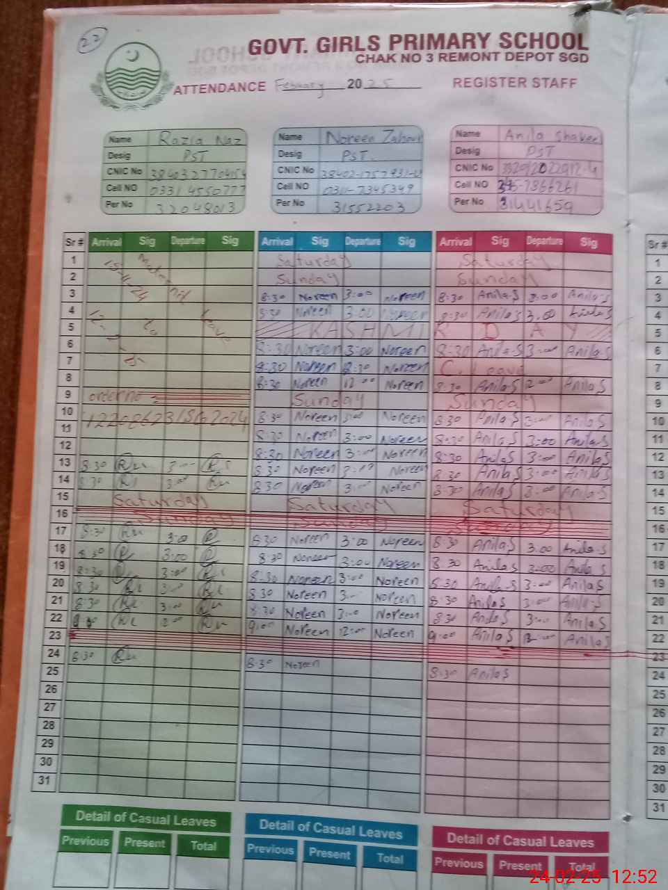 | CNIC | Full Name | Designation | R/C | Absence during last cal. month |
