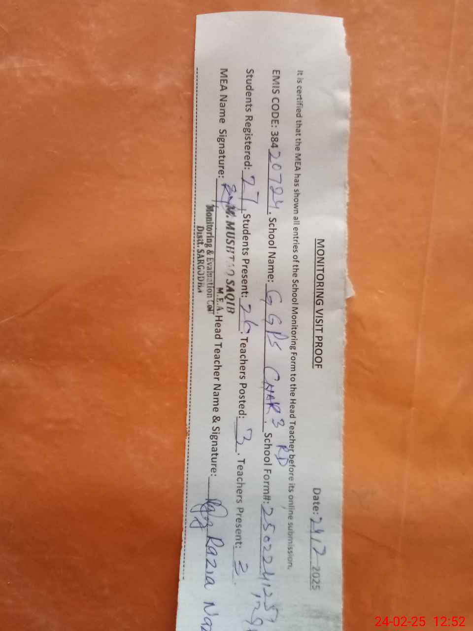 | Attendance Register | Head Teacher | MEA with School | Visit Proof |
