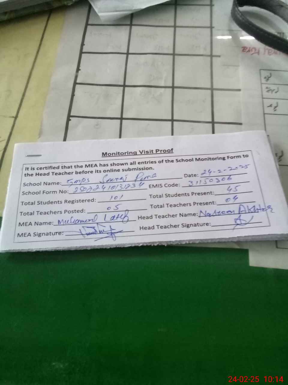 | Attendance Register | Head Teacher | MEA with School | Visit Proof |