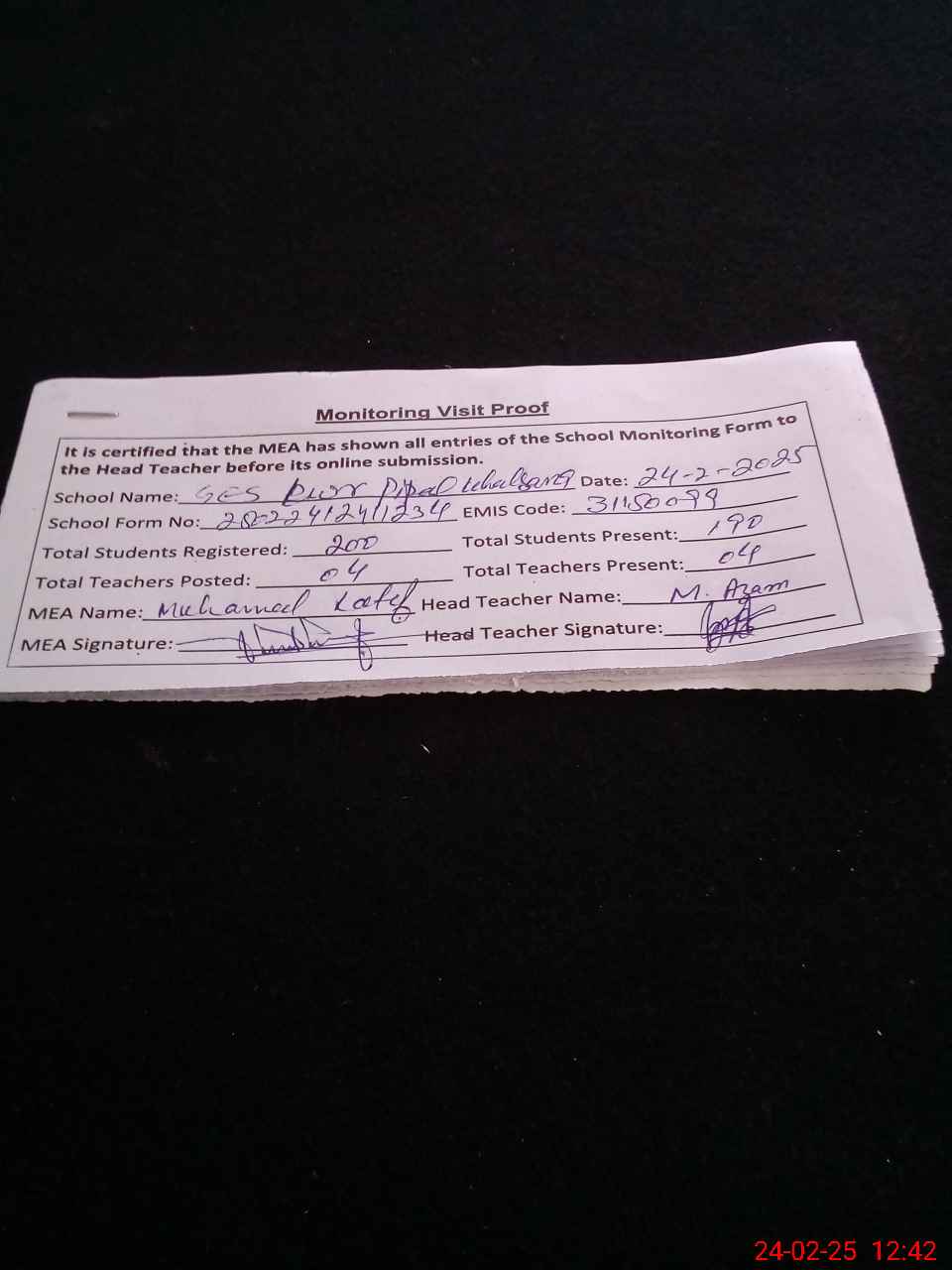 | Attendance Register | Head Teacher | MEA with School | Visit Proof |