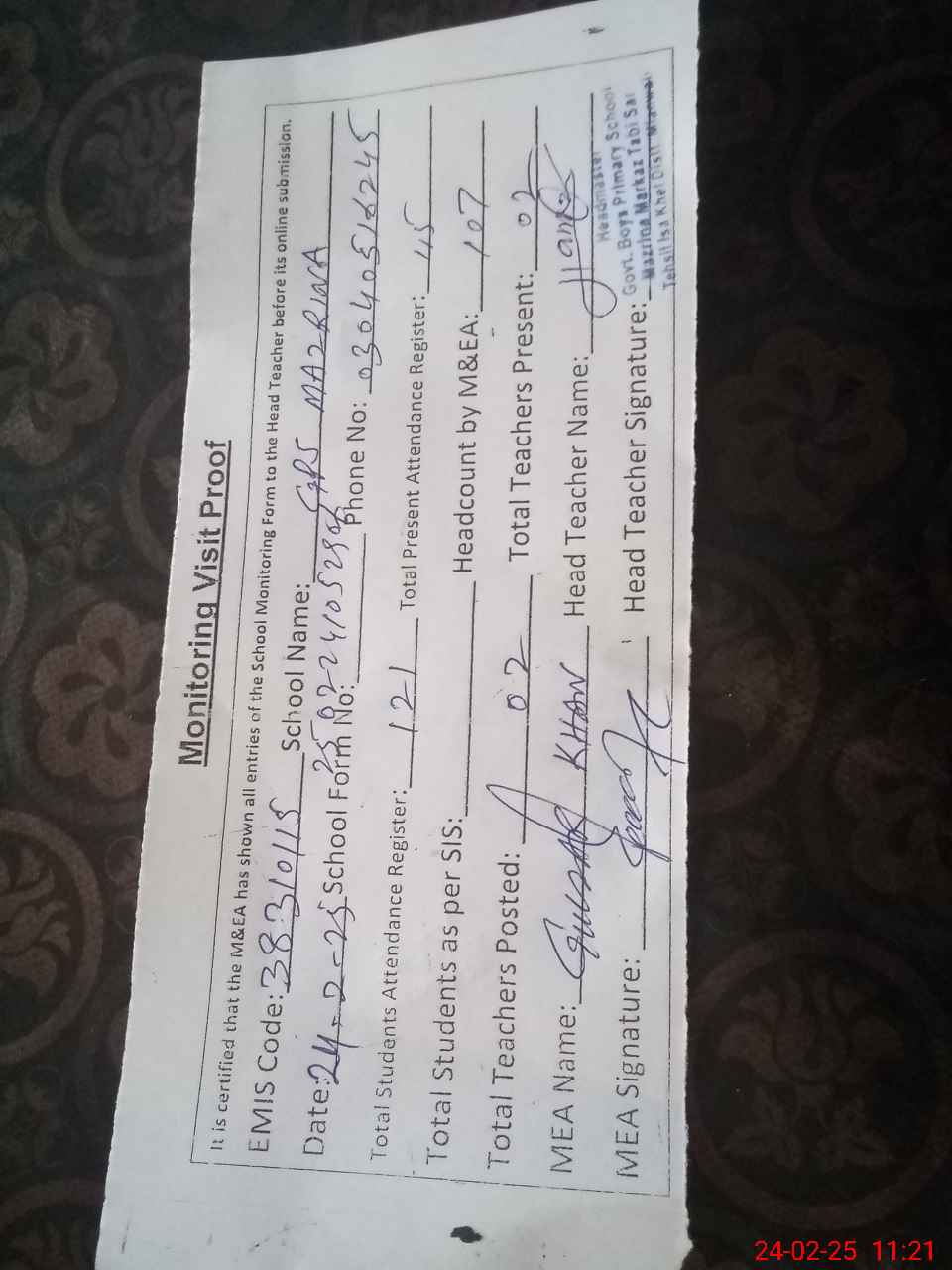 | Attendance Register | Head Teacher | MEA with School | Visit Proof |
