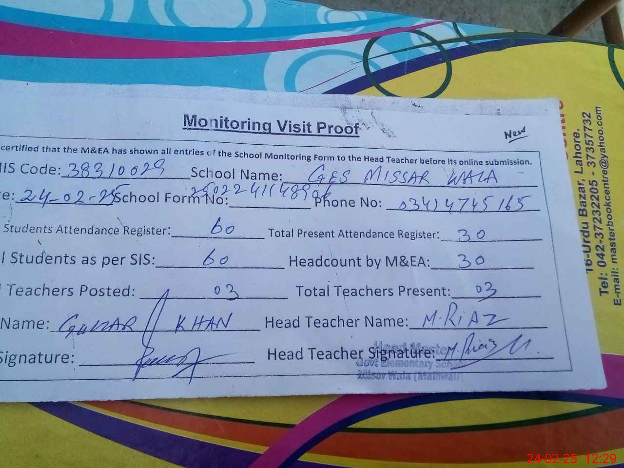 | Attendance Register | Head Teacher | MEA with School | Visit Proof |