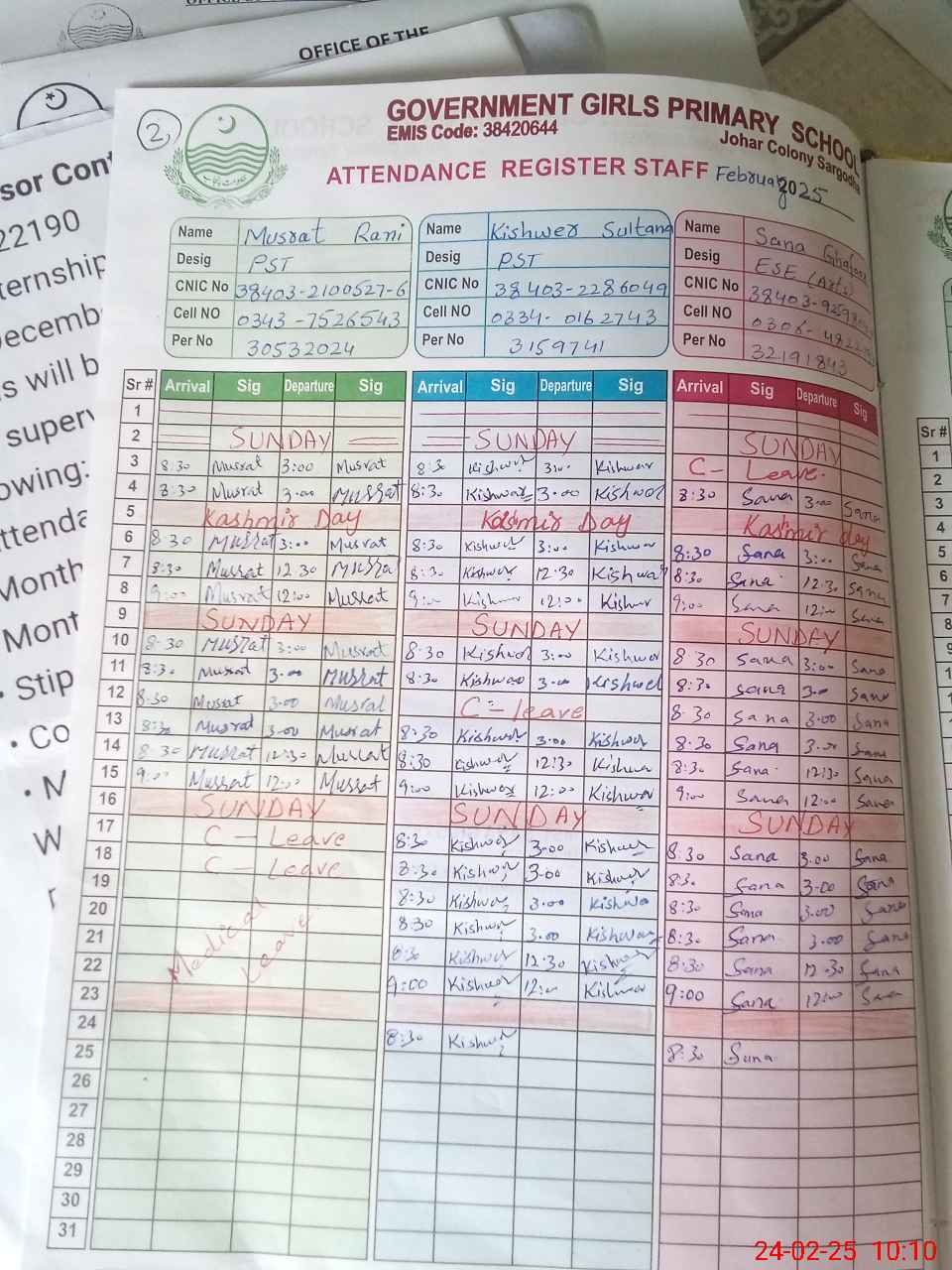 | CNIC | Full Name | Designation | R/C | Absence During Last Calender Month |