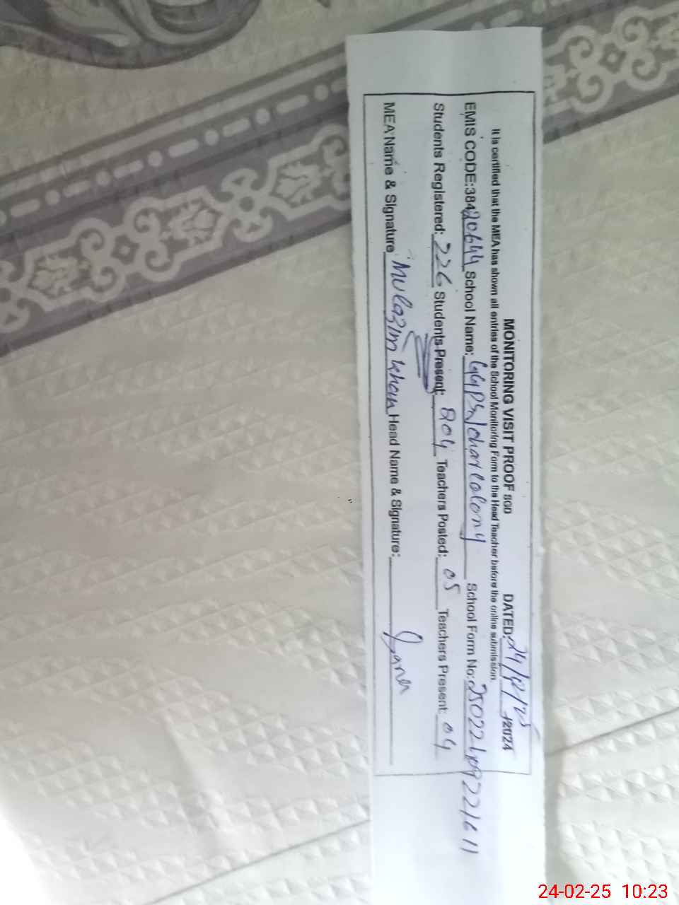 | Certified that this School was Inspected by the Undersigned MEA/DMO Today and the Information Stated Above is as Per Record. | |||||