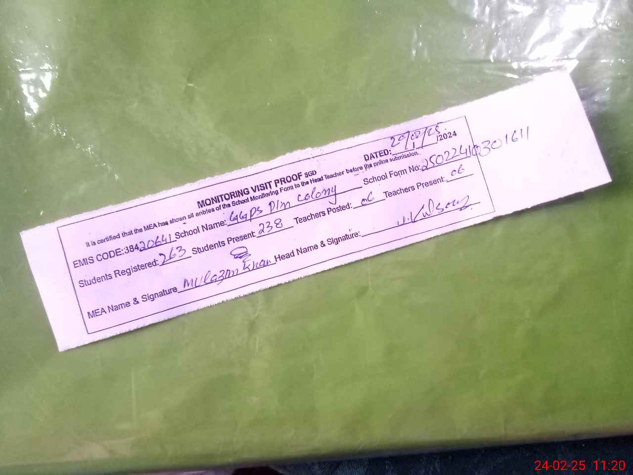 | Attendance Register | Head Teacher | MEA with School | Visit Proof |
