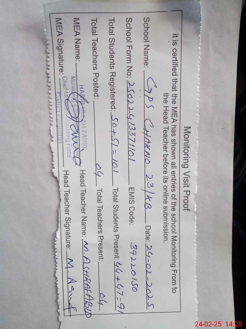 | Attendance Register | Head Teacher | MEA with School | Visit Proof |