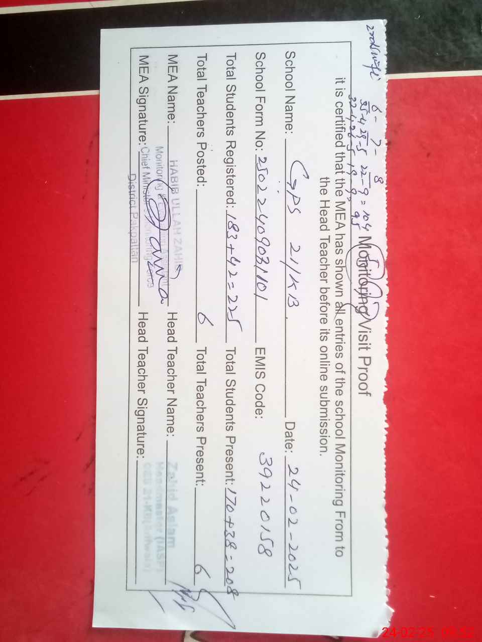 | Attendance Register | Head Teacher | MEA with School | Visit Proof |