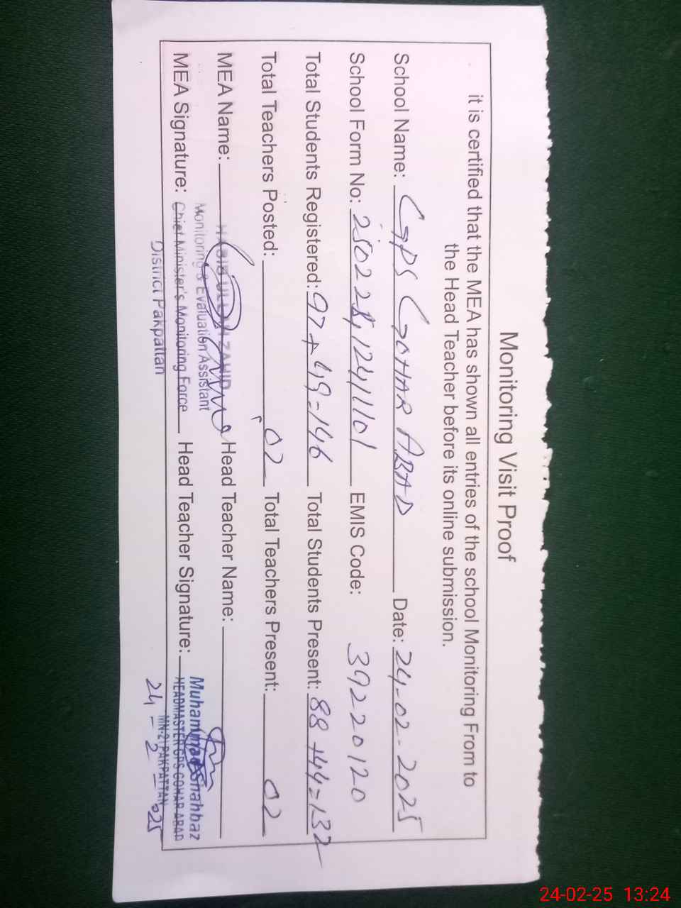 | Attendance Register | Head Teacher | MEA with School | Visit Proof |