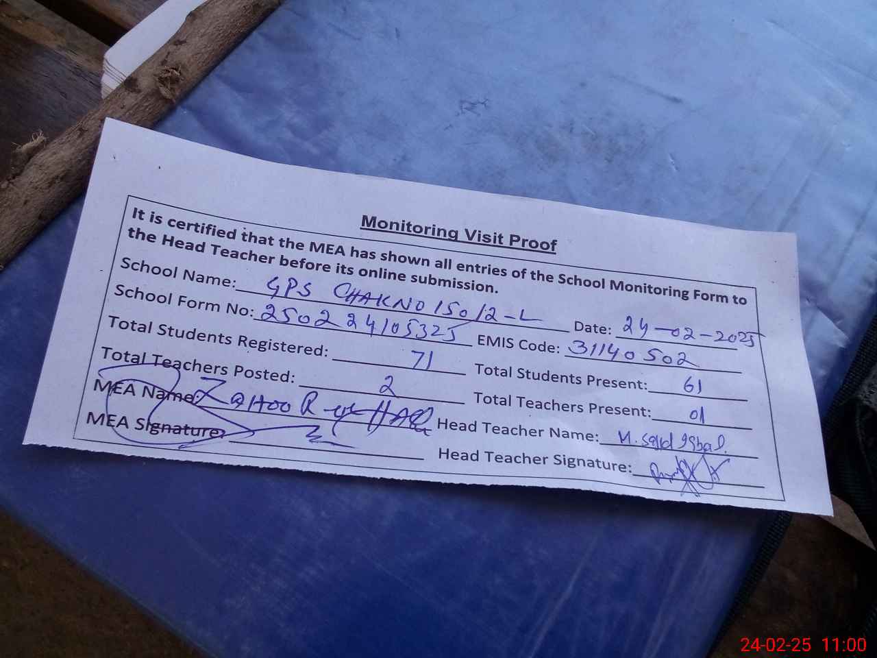 | Attendance Register | Head Teacher | MEA with School | Visit Proof |