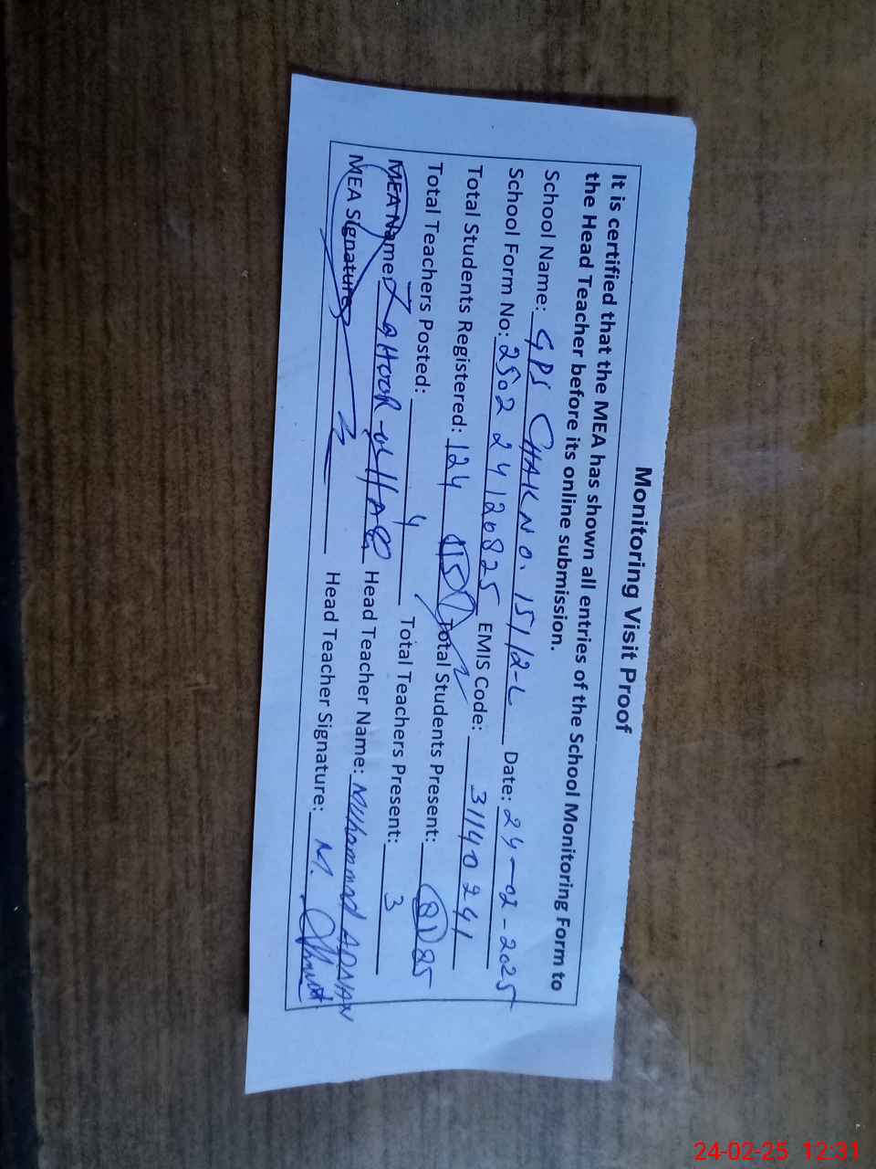 | Attendance Register | Head Teacher | MEA with School | Visit Proof |