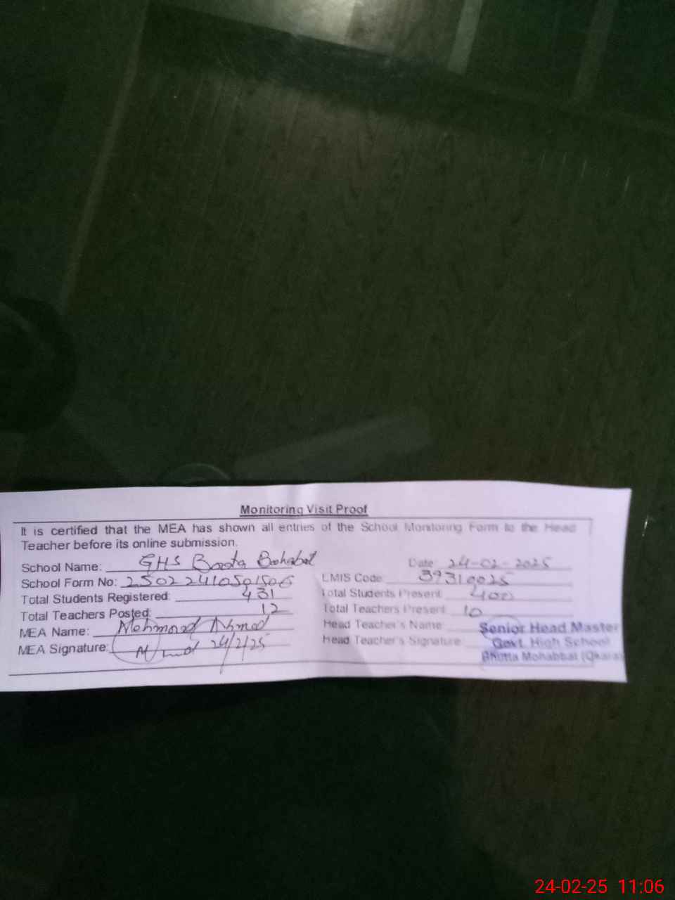 | EMIS Code: 39310025 | Name of School: GHS BHUTTA MOHABAT | |||